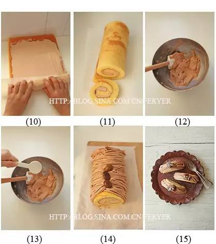 ①100g蛋黄加入20g绵白糖,搅打至粘稠,呈乳白色至体积膨胀。②蛋黄打好后,冷藏室取出蛋白,先用手动或电动打蛋器搅打,整体起泡后,一次性加入70g绵白糖,搅打至顺滑,蛋白呈白色,且纹理呈水波纹状;打到蛋白捞起缓缓从打蛋器上落下,落在盆中形成的纹理不变,而未凝固在打蛋器上即可。③蛋黄糊加入蛋白中,用手动打蛋器将二者捞起拌匀,拌匀后用刮刀将盆边的蛋糊都整理到盆里中间(拌时并不是搅拌,是无规则的捞着拌且此过程中需即刻处理)④筛入50g低筋面粉,用橡皮刮刀翻拌均匀,均匀即可。⑤接着将隔水融化呈液体状的黄油倒在刮刀上,快速的翻拌均匀。⑥均匀后即刻倒入铺有烘焙纸的烤盘中,稍刮平,放入预热好的烤箱中下层,180-190℃,烘烤12-15分钟分钟,至表面呈现漂亮的烘焙色,有弹性无沙沙声~出炉后带着烘焙纸马上离开烤盘,放在网架上放凉,然后再撕去烘焙纸。⑦取栗子泥,如图(7)所示,用勺等工具将其碾至顺滑状,如果水分较大,可以放在小火上搅拌几下。⑧从冷藏室中取出200g鲜奶油倒入盆中,加入20g细砂糖;利用电动搅打器搅打至鲜奶油逐渐出现纹理的8分发状态,放入栗子泥,搅打至鲜奶油呈固体状即可,涂抹前可放入冰箱冷藏保存。⑨蛋糕片下垫一张油纸,将馅料涂在蛋糕片内部,起始端奶油稍厚,末端奶油稍薄,最后3cm左右不涂奶油。