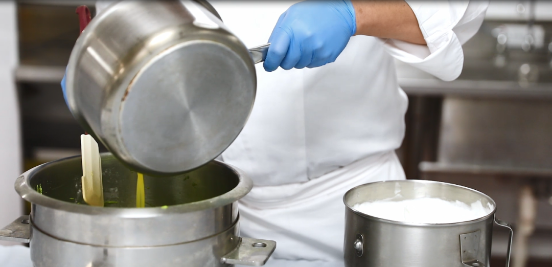 ⑤取一部分甘纳许倒入均质机中,添入适量黄色素、绿色素,均质。⑥接着,倒入剩余的甘纳许中混合均匀。