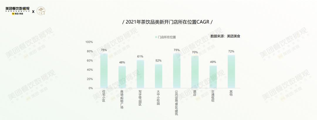 点击查看高清原图5、社区成为新目标:新开店选址更倾向住宅小区从2021年美团数据来看,茶饮新开门店更倾向于住宅小区,其次是写字楼/园区。一方面,受疫情影响,房租成本压力之下,近两年茶饮门店选址更倾向于商圈之外;另一方面,茶饮真正走入日常,更多地融入生活场景,茶饮的客群也不再局限于逛街聚会的“奶茶女孩”,而是逐渐向全民化拓展。