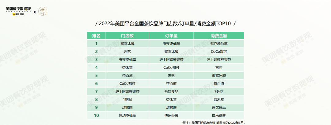 美团门店数统计截至2022年8月,点击查看高清原图2022年沪上阿姨订单同比增长量排全国茶饮品牌第一,其次是茶百道、吾饮良品,近两年较火的柠檬茶主打品牌也纷纷上榜。
