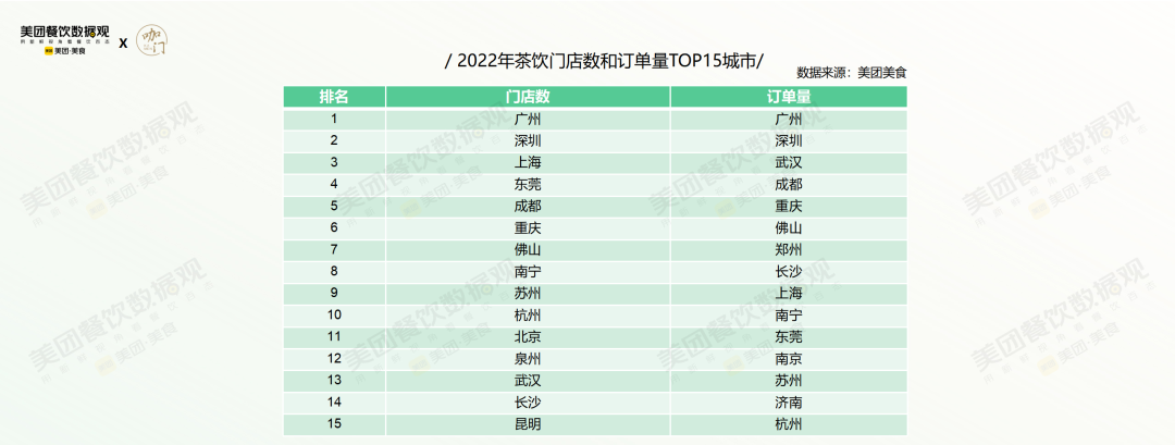 点击查看高清原图4、五城门店增速显著,南宁、佛山增量可期美团数据统计,2022年茶饮订单量或门店数上榜TOP10城市均包括:广州、深圳、上海、成都、重庆、佛山、南宁、苏州、杭州等;佛山、南宁等小众城市数据表现不俗,值得未来关注。