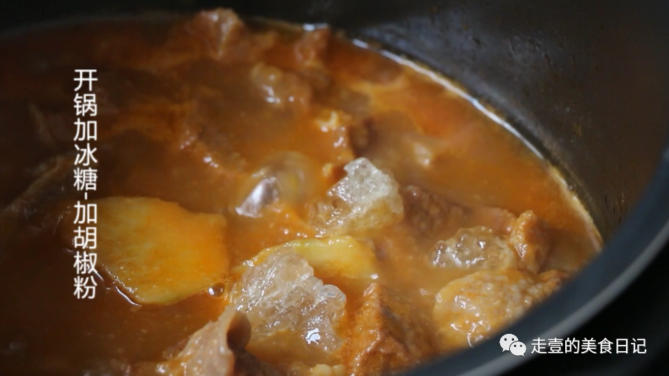 ⑥消气后开盖,根据咸甜度加入胡椒粉及冰糖。倒入胡萝卜和马铃薯,继续炖煮15分钟。