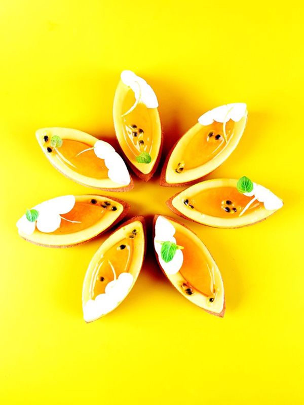 后来他与蓝带学院结缘,开始从事教育事业的工作;幸运之神一直没有忘记光顾他,2017年,他进入西诺迪斯担任西点研发经理。丰富的教学和甜点研发经验,让Nicolas在甜点创作中形成了自己独特的个人风格:1. 传统地道的法式甜点在他手里通过口味重组搭配、造型创新等二次创作,能够重新焕发不一样的风采;2. 他的作品保有法式甜点风,但又不乏当下非常流行的 现代创新甜点元素 ,他还很擅长根据食客喜好调整自己的配方;3.他不喜欢过于繁琐的造型和层次搭配:“对我来说,简洁就是最好的,不管是口味还是造型。”所以,在对Nicolas有过一些了解之后,我觉得是时候揭晓文章开头他绘制的 6款夏日水果风创意甜点 手稿的庐山真面目了:01日本柚子柑橘蛋糕☟