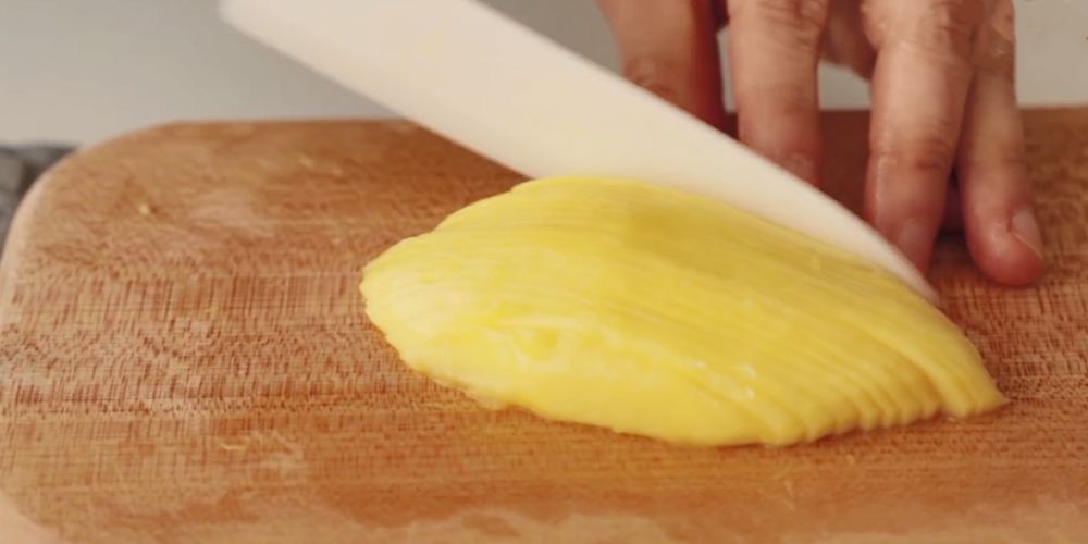 7. 轻震去除多余的气泡,放冰箱冷冻2h组合装饰1. 新鲜芒果去核削皮,切成长条薄片