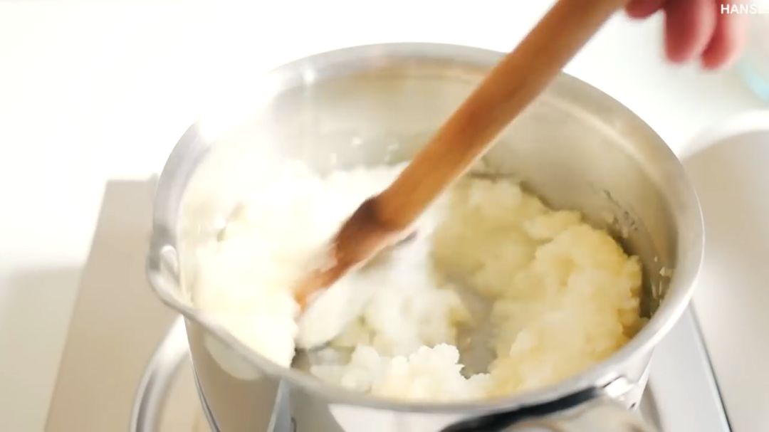 ④慢慢倒入中筋面粉,边加热边用刮刀不断搅拌。