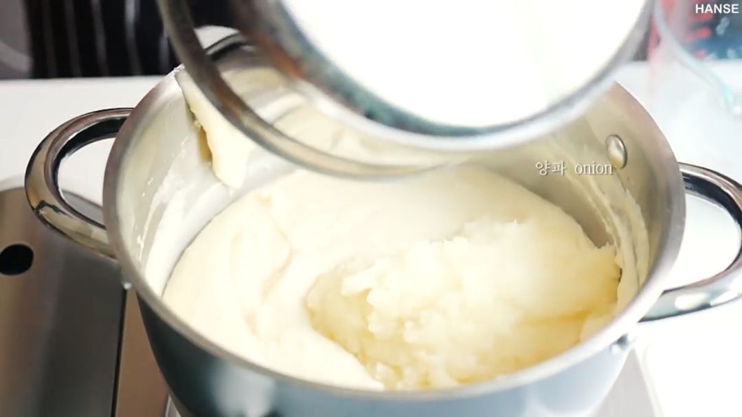 ⑤无结块后,边搅拌边倒入一半牛奶;完全融合以后再倒入另一半,继续搅拌。